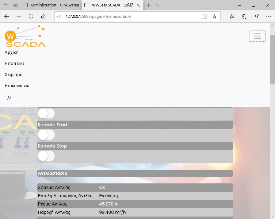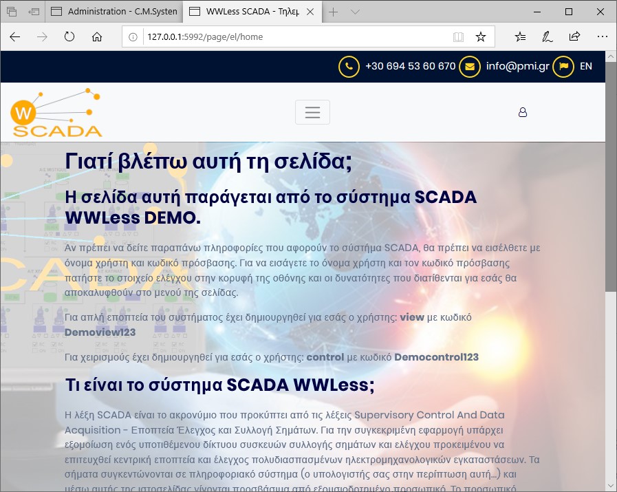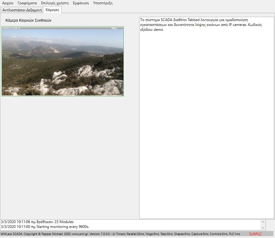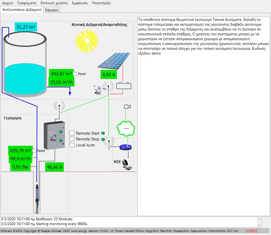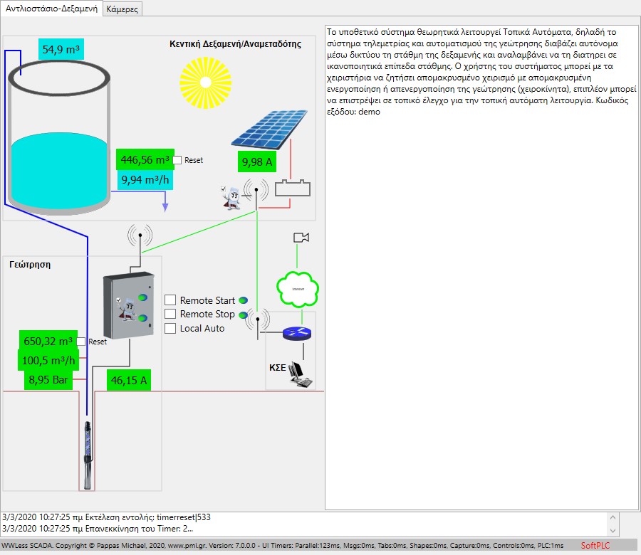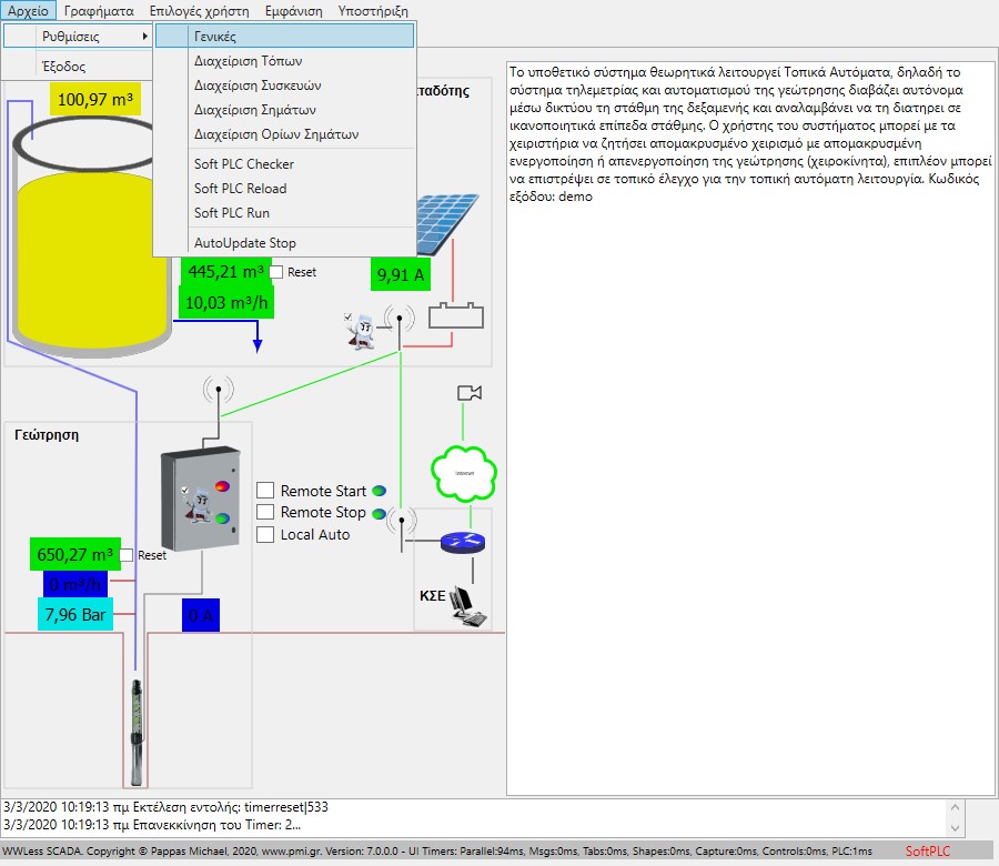 Μέσα από μια εξερεύνηση για τον τρόπο που δουλεύουν οι προγραμματιζόμενοι λογικοί ελεγκτές, δημιουργήθηκε ένα λογισμικό εξομοίωσης της λειτουργίας ενός PLC. Φυσικά μια τέτοια λειτουργία ενσωματώθηκε στο σύστημα. Άλλωστε κάποιος γνώστης συστημάτων αυτοματισμού δεν θα μπορούσε να παραμείνει στα απλά σενάρια συμβάντος-γεγονότος που διαμορφώνονται μέσα από συμπλήρωση πινάκων. Για τον έμπειρο γνώστη διατίθεται λειτουργία scripting σε μορφή STL ή Javascript. Η αλληλεπίδραση του συστήματος Scripting με το SCADA συμβαίνει με ένα μοναδικό τρόπο: Το σύστημα Scripting είναι ένας εικονικός Ελεγκτής Προγραμματιζόμενης Λογικής (PLC) με εισόδους και εξόδους τα σήματα του SCADA. Μάλιστα κάθε σήμα διατίθεται ως πρωτόγεννής τιμή (όπως διαβάστηκε από την εκάστοτε συσκευή), ως τιμή φυσικού μεγέθους (όπως μετατράπηκε από τις ρυθμίσεις του SCADA) ή ως λογική κατάσταση που εκπληρώνει η τιμή του σήματος για κάθε μια από τις καταστάσεις (κάτω από ελάχιστη, ελάχιστη έως χαμηλή, χαμηλή έως υψηλή, υψηλή έως μέγιστη, πάνω από μέγιστη) – όπως ορίστηκαν στους πίνακες του SCADA. Οι έξοδοι του συστήματος μπορεί να εντολοδοτούν απευθείας τις συσκευές ή αντίστοιχα σήματα του SCADA. Μια σημαντική παράμετρος που τίθεται είναι η μη εκτέλεση τμημάτων που αφορούν συγκεκριμένες συσκευές, εφόσον οι συσκευές δεν είναι συνδεδεμένες στο δίκτυο ή έχουν προσωρινή απώλεια σήματος. Επιπλέον συσκευές με απώλεια σήματος μπορούν να αναλάβουν την εκτέλεση ενεργειών ασφαλείας με τη δική τους προγραμματιζόμενη λογική – εκτός του συστήματος. Όπως ένα φυσικό PLC, έτσι και το λογισμικό PLC (SoftPLC) εκτελεί κυκλικά τον κώδικα. Οι κύκλοι του ελεγκτή είναι σημαντικά ταχύτεροι από τους αντίστοιχους κύκλους του SCADA και παράγεται πάντα αποτέλεσμα πολλές φορές πριν το SCADA στείλει τιμή στις συσκευές. Φυσικά ένας απλός προσωπικός υπολογιστής μπορεί να εκτελεί αποτελεσματικά αρκετά περίπλοκα σενάρια. Στο περιβάλλον του SCADA αναπτύχθηκαν και επιμέρους ελεγκτές (υπό τη μορφή λογισμικού) όπως ολοκληρωτές σημάτων, χρονικά, ελεγκτές PID κλπ.